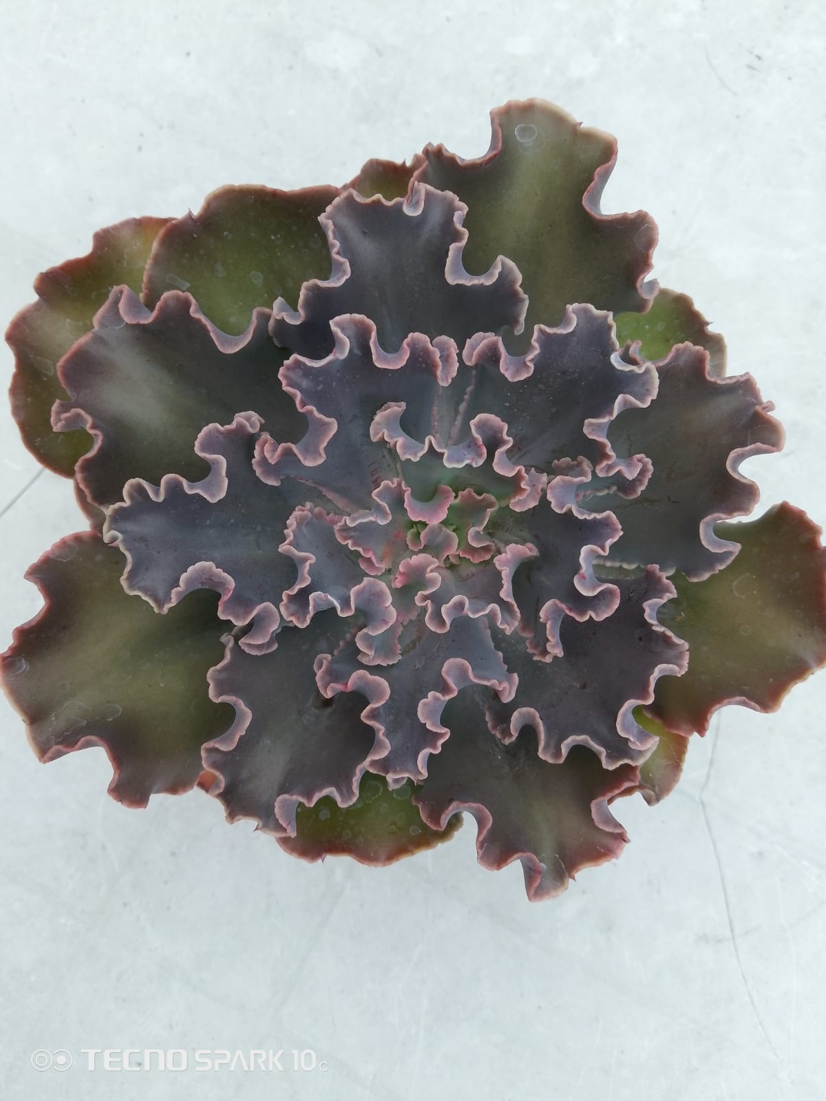 Esta suculenta es un verdadero deleite visual, caracterizada por sus bordes de hoja rizados y ondulados, lo que le da un aspecto de encaje o coral. Su coloración es una mezcla sofisticada de tonos grises, púrpura y un delicado borde rosado, haciéndola parecer una pieza de alta costura natural.